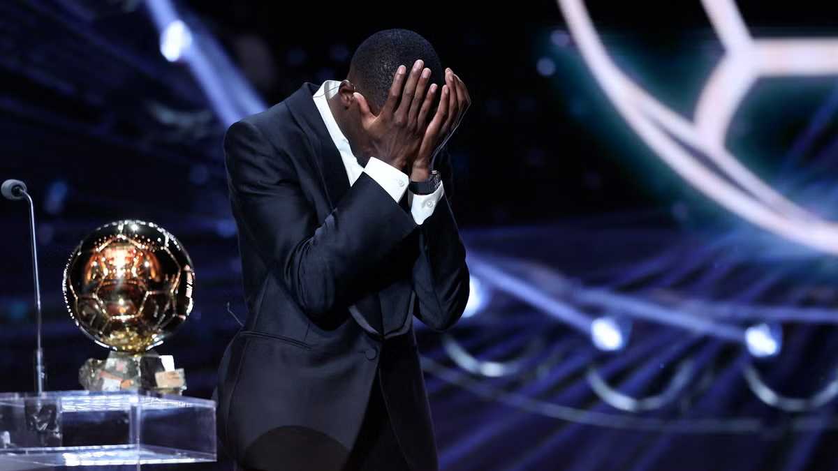 প্যারিসে পুরস্কার হাতে নিয়ে পরিবারের ত্যাগের জন্য কৃতজ্ঞতা জানাতে গিয়ে কান্নায় ভেঙে পড়েন দেম্বেলে—এ যেন তার ক্যারিয়ারের সব উত্থান-পতনের প্রতিচ্ছবি।