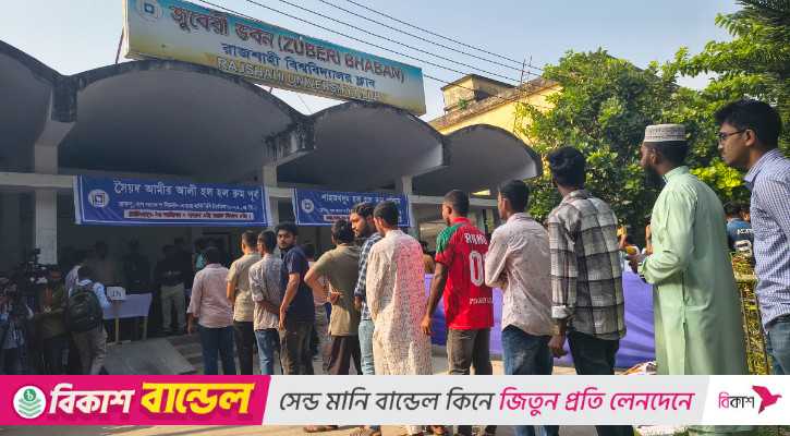 সকালে রাবির জুবেরি, ডিনস কমপ্লেক্স, রবীন্দ্র ভবন কেন্দ্র ঘুরে দেখা যায় লাইনে দাঁড়িয়ে ভোট দিচ্ছেন শিক্ষার্থীরা।