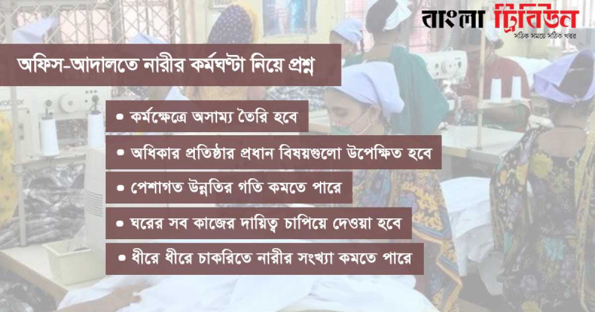 নারীর কর্মঘণ্টা ৮ ঘণ্টা থেকে ৫ ঘণ্টায় নামানোর মধ্য দিয়ে সমতা প্রতিষ্ঠার প্রাথমিক শর্ত লঙ্ঘন করা হবে বলে মনে করেন বাংলাদেশ মহিলা পরিষদ সভাপতি ডা. ফওজিয়া মোসলেম। তিনি বলেন, ‘‘৮ ঘণ্টা থেকে ৫ ঘণ্টা করার যুক্তি হিসেবে বলা হচ্ছে—নারী বাড়িতে সন্তানকে বেশি সময় দিতে পারবে। কিন্তু বাড়ির কাজ তো নারীর একার না। কর্মঘণ্টা কমানো বাড়ানোর বিষয়টা নারীর ক্ষমতায়নের সঙ্গে জড়িত না। প্রশ্ন হলো, নারীর শ্রমের মূল্যায়ন হবে কিনা, সমান মযার্দা, সমান সুযোগ পাচ্ছে কিনা। আমরা নারীকে অর্থনীতির মূলধারায় তার ক্ষমতা অনুযায়ী কাজের সুযোগ দেওয়া হচ্ছে কিনা, সেটা নিয়ে ভাবছি না, কর্মক্ষেত্রে নারীর অনিরাপদ পরিবেশ নিয়ে কথা বলছি না, নারী কর্মক্ষেত্রে গেলে বাড়ির কাজ শেয়ার করতে হবে, সেটাতে মনোযোগ দিচ্ছি না বলেই নারীরা এই ঘণ্টা কমানো নিয়ে খুশি হতে পারছে না।’’