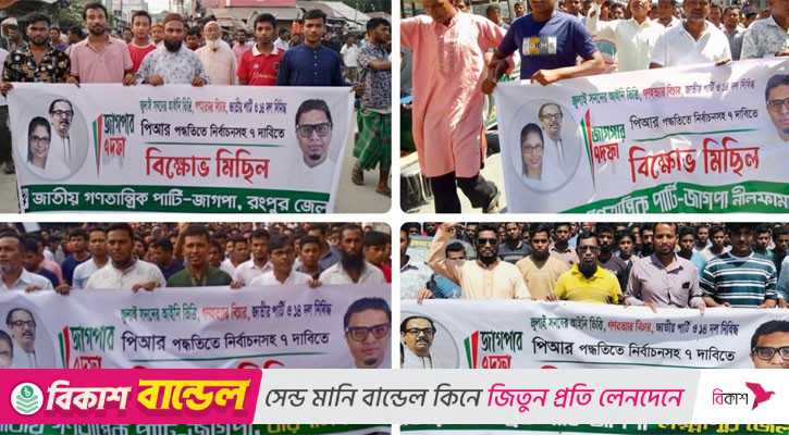 জুলাই সনদের আইনি ভিত্তি, গণহত্যার বিচার, জাতীয় পার্টি ও ১৪ দল নিষিদ্ধ, পিআর পদ্ধতিতে নির্বাচনসহ ৭ দাবিতে দেশের ২০ জেলায় বিক্ষোভ মিছিল করেছে জাতীয় গণতান্ত্রিক পার্টি-জাগপা।