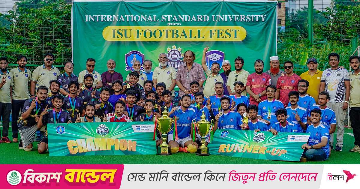 ইন্টারন্যাশনাল স্ট্যান্ডার্ড ইউনিভার্সিটি (আইএসইউ) স্পোর্টস ক্লাবের আয়োজনে আইএসইউ ফুটবল ফেস্ট, সিজন–১ চ্যাম্পিয়ন হয়েছে বাইনারি ব্লাস্টার্স। গতকাল সোমবার বিকেলে রাজধানীর রয়েল মাল্টিস্পোর্টস এরেনায় চ্যাম্পিয়ন ও রানার্সআপ দলের হাতে ট্রফি তুলে দেন আইএসইউ উপাচার্য আব্দুল আউয়াল খান ও জাতীয় ফুটবল দলের সাবেক খেলোয়াড় ফুটবলার কায়সার হামিদ।