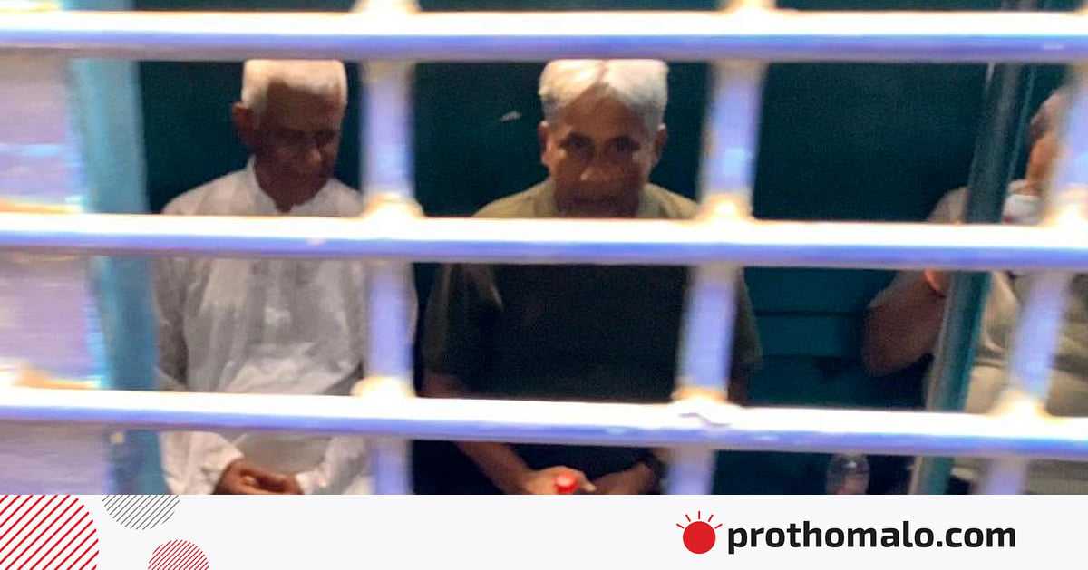 বেলা দুইটার পর হাজতখানা থেকে প্রথমে বের করে আনা হয় অবসরপ্রাপ্ত বিচারপতি শামসুদ্দীন চৌধুরীকে। তখনো তাঁর দুই হাত পেছনে হাতকড়া পরানো অবস্থায় দেখা যায়। মাথা নিচু করে দাঁড়িয়ে ছিলেন তিনি। তাঁর পেছনে দাঁড়িয়ে ছিলেন আবদুস সালাম মুর্শেদী ও দিলীপ কুমার আগরওয়ালা। তাঁদের প্রত্যেকের দুই হাত ছিল পেছনে, পরানো হাতকড়া। প্রত্যেকে মাথা নিচু করে দাঁড়িয়ে ছিলেন। এরপর পুলিশ তাঁদের আদালত চত্বরে রাখা প্রিজন ভ্যানের দিকে নিয়ে যেতে থাকে। প্রথমে অবসরপ্রাপ্ত বিচারপতি শামসুদ্দীন চৌধুরীর দুই বাহু ধরে প্রিজন ভ্যানের ভেতরে তোলেন পুলিশ সদস্যরা। পরে প্রিজন ভ্যানের ভেতরে ওঠেন সালাম মুর্শেদী ও দিলীপ কুমার আগরওয়ালা।