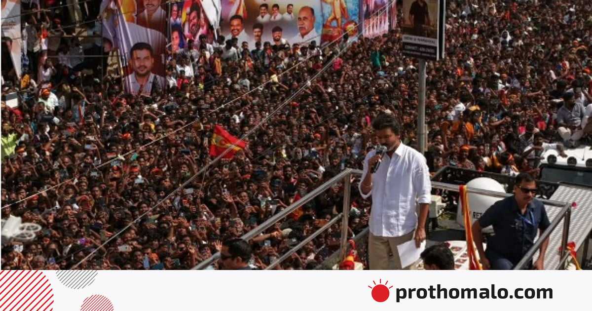স্থানীয় গণমাধ্যমের ভিডিওতে দেখা গেছে, হাজারো মানুষ একটি বড় গাড়ির চারপাশে জড়ো হয়েছেন। সেই গাড়ির ওপর দাঁড়িয়ে বক্তব্য দেন বিজয়। ভিড় নিয়ন্ত্রণের বাইরে চলে গেলে তাঁকে পুলিশের সহায়তা চাইতে দেখা যায়।
