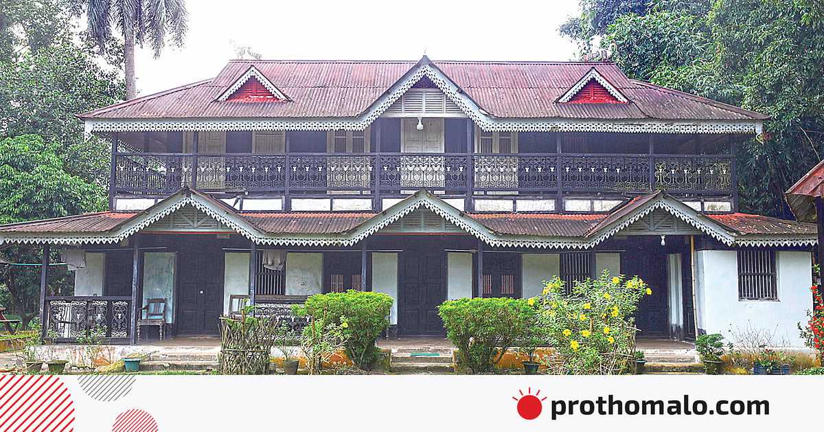জমিদারদের কাঠের আসাম–টাইপ স্থাপত্যরীতিতে দোতলা বাড়ির ভেতরে ঢুকে দেখা গেল, ঘরটিতে ছয়টি কক্ষ রয়েছে। টিনের চালে সাবেকি নকশা। টিন, কাঠ আর ব্যাটনে নির্মিত ঘরের ভেতরে বিভিন্ন কক্ষে খাট, টেবিল, চেয়ারসহ পুরোনো সব আসবাব আছে। রয়েছে একালের কিছু আসবাবও। কাঠের সিঁড়ি বেয়ে দোতলায় যেতে হয়। ঘরের দেয়ালে কোথাও কোথাও ঝুলছে জমিদার পরিবারের বিভিন্নজনের আলোকচিত্র। কোথাও আবার দেব–দেবীর ছবি আছে। এখানে-সেখানে পড়ে আছে পিতল-তামার কিছু বাসন আর শোপিস।