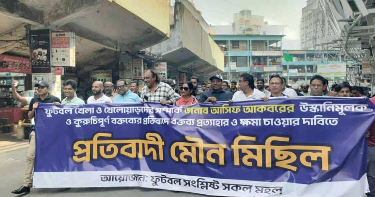 বিসিবির নতুন পরিচালক ও কণ্ঠশিল্পী আসিফ আকবর ১০ নভেম্বর বাংলাদেশ ক্রিকেট কনফারেন্সে ফুটবল ও ফুটবলারদের সম্পর্কে নেতিবাচক মন্তব্য করেছেন। এরপর থেকেই ফুটবলাঙ্গনে চলছে তীব্র সমালোচনা। বুধবার জাতীয় স্টেডিয়ামে সাবেক ফুটবলার, কোচ ও সংগঠকরা আসিফের বক্তব্য প্রত্যাহার ও ক্ষমা চাওয়ার দাবি জানিয়ে মৌন মিছিল করেছেন। জাতীয় স্টেডিয়ামের এক নম্বর গেট থেকে প্রেস ক্লাব প্রদক্ষিণ করে আবার আগের জায়গায় এসে মৌন মিছিলটি শেষ হয়। মিছিল শুরুর আগে জাতীয় দলের সাবেক কোচ মারুফুল হক বলেছেন, ‘আমাদের প্রতিবাদ মিছিলের পর আসিফ আকবর যদি কোনও পদক্ষেপ বা ব্যবস্থা না নেন তাহলে তিন দিনের মধ্যে আমরা আমাদের মুরুব্বিদের সঙ্গে আলোচনা করে কঠোর কর্মসূচি ঘোষণা করবো।’