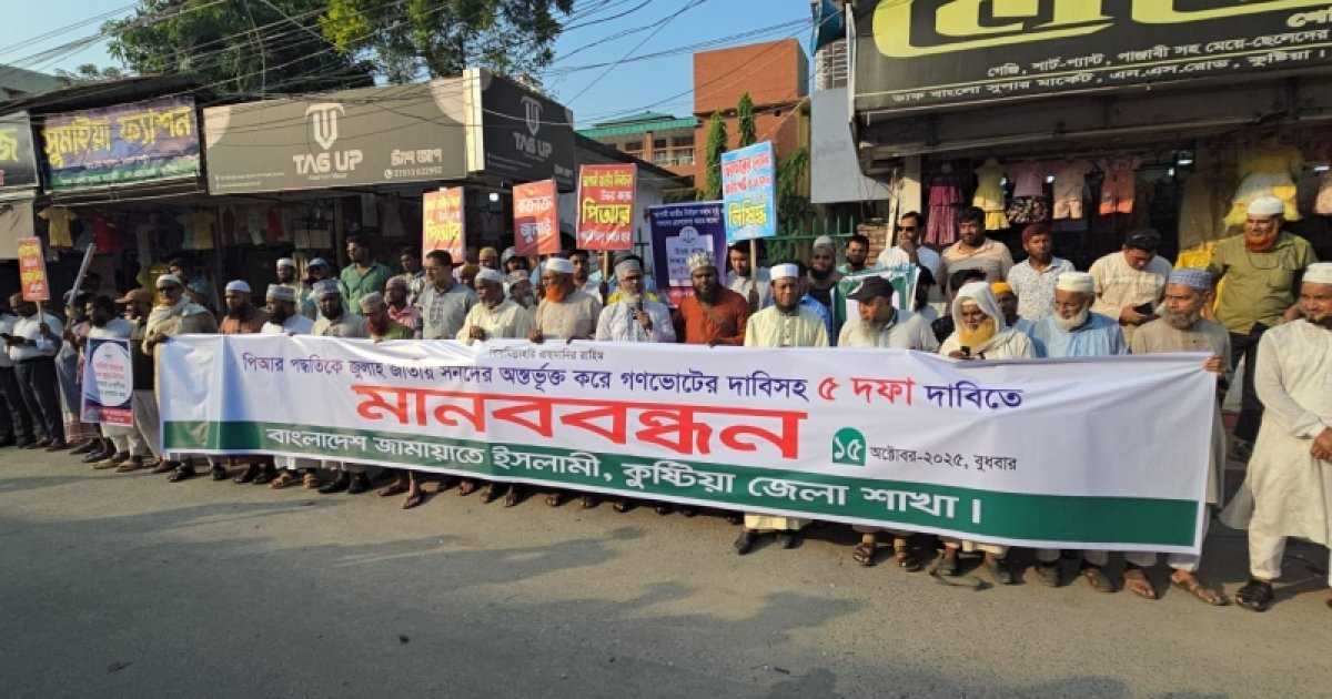 পিআর পদ্ধতিতে জাতীয় সংসদ নির্বাচন, জুলাই সনদ ঘোষণা ও বাস্তবায়নসহ ৫ দফা দাবিতে বুধবার (১৫ অক্টোবর) বিকালে কুষ্টিয়ায় অনুষ্ঠিত মানববন্ধন এ মন্তব্য করেন।