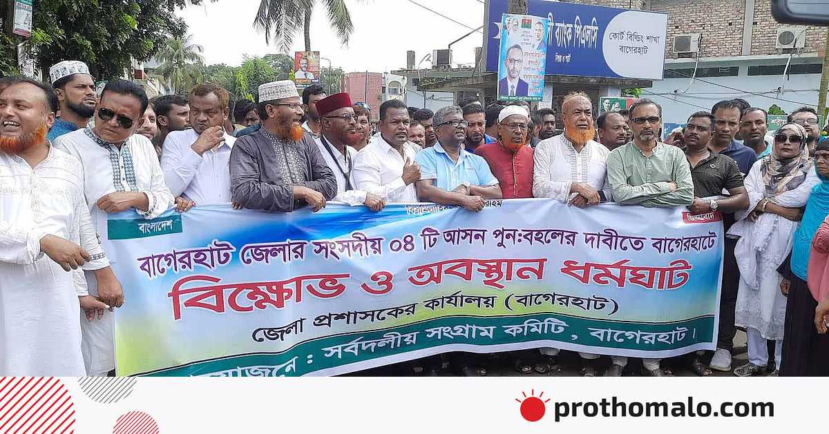 বাগেরহাটে চারটি সংসদীয় আসন বহাল রাখার দাবিতে সর্বদলীয় সম্মিলিত কমিটি জেলা প্রশাসক ও জেলা নির্বাচন কর্মকর্তার কার্যালয়ের সামনে অবস্থান কর্মসূচি পালন করেছে। আজ রোববার সকাল থেকে বিভিন্ন রাজনৈতিক দলের নেতা-কর্মীরা জেলা প্রশাসকের কার্যালয়ের প্রধান ফটকে অবস্থান নেন। পরে মিছিল নিয়ে জেলা নির্বাচন কর্মকর্তার কার্যালয়ের সামনে গিয়ে প্রবেশপথ বন্ধ করে দেন এবং চারটি আসন বহালের দাবিতে স্লোগান দেন।