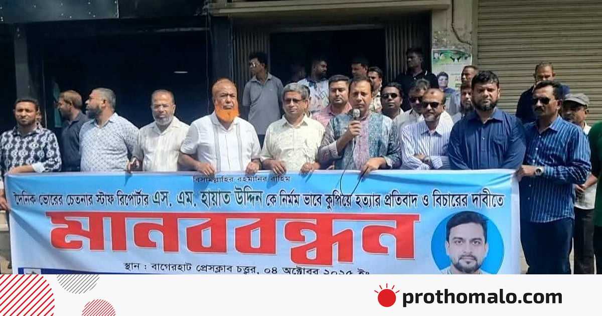 মানববন্ধনে বাগেরহাট প্রেসক্লাবের সভাপতি মো. কামরুজ্জামান, সাধারণ সম্পাদক তরফদার রবিউল ইসলাম, টেলিভিশন জার্নালিস্ট অ্যাসোসিয়েশনের সাধারণ সম্পাদক মাসুদুল হক, সাংবাদিক এস এম রাজ, আহাদ উদ্দিন হায়দার, হেদায়েত হোসেন, ইয়ামিন আলী, কামরুজ্জামান প্রমুখ বক্তব্য দেন। বক্তারা বলেন, একজন সংবাদকর্মীকে প্রকাশ্যে কুপিয়ে হত্যা করা হলো। অথচ পুলিশ এখনো কাউকে আটক করতে পারেনি। হত্যাকাণ্ডে জড়িত ব্যক্তিদের ৪৮ ঘণ্টার মধ্যে গ্রেপ্তার না করলে সংবাদকর্মীরা কঠোর কর্মসূচি দেবেন।