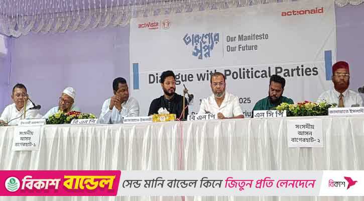 বাগেরহাট: বাগেরহাটে ত্রয়োদশ জাতীয় সংসদ নির্বাচনে বিভিন্ন দলের প্রার্থী ও মনোনয়ণ প্রত্যাশীদের নিয়ে “তারুণ্যের স্বপ্ন, আমাদের ইশতেহার-আমাদের ভবিষ্যৎ” শীর্ষক নির্বাচনী ইশতেহার প্রনয়ন বিষয়ক সংলাপ অনুষ্ঠিত হয়েছে। বেসরকারি উন্নয়ন সংস্থা এ্যাকশন এইড ও বাধন মানব উন্নয়ন সংস্থার যৌথ আয়োজেনে সোমবার ( ১৩ অক্টোবর) দিনব্যাপি এই সংলাপ অনুষ্ঠিত হয়।