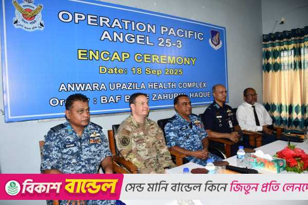 চট্টগ্রাম: বাংলাদেশ বিমান বাহিনী ও যুক্তরাষ্ট্রের প্যাসিফিক এয়ার ফোর্সের অংশগ্রহণে চলমান ৭ দিনব্যাপী যৌথ মহড়া ‘অপারেশন প্যাসিফিক অ্যাঞ্জেল ২৫-৩’ এর অংশ হিসেবে আনোয়ারা উপজেলা স্বাস্থ্য কমপ্লেক্সে ENCAP Ceremony অনুষ্ঠিত হয়েছে।