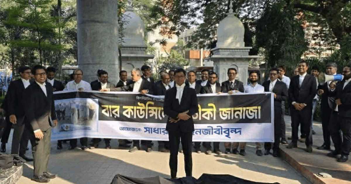 বৃহস্পতিবার (২০ নভেম্বর) দুপুরে বার কাউন্সিলের সামনে প্রতীকী জানাজা অনুষ্ঠিত হয়।
