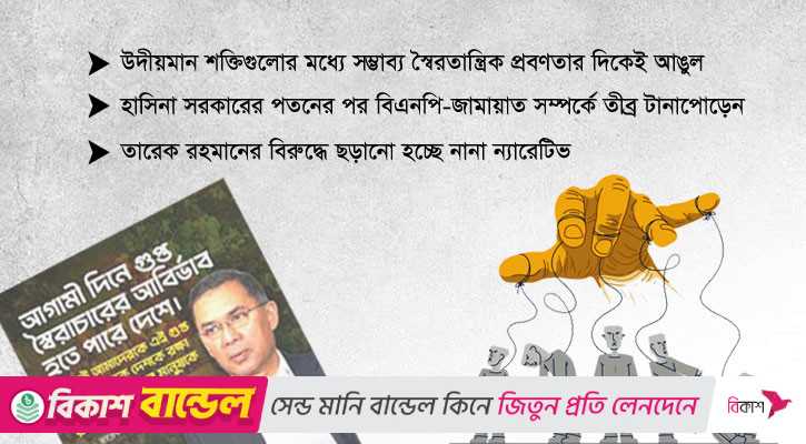 বিএনপির ভারপ্রাপ্ত চেয়ারম্যান তারেক রহমানকে ঘিরেও নানা ন্যারেটিভ ছড়ানো হচ্ছে সামাজিক যোগাযোগ মাধ্যমে। অভিযোগ আছে, জামায়াত সক্রিয়ভাবে এসব প্রচারণায় অংশ নিচ্ছে এবং তাকে চাঁদাবাজ প্রমাণ করার প্রচেষ্টাও চালাচ্ছে। একই সঙ্গে বিএনপির বিরুদ্ধে মিডিয়া ট্রায়াল চালানো হচ্ছে, যা গণতান্ত্রিক পরিবেশকে আরও জটিল করে তুলছে। রাজনীতি সংশ্লিষ্টদের মতে, সোশ্যাল মিডিয়ায় বিএনপিকে ঘিরে অপপ্রচার চালানো জামায়াতের একটি চাপ প্রয়োগের কৌশল। তারেক রহমান হয়তো এই প্রক্রিয়াকেও ‘গুপ্ত স্বৈরাচারী’ ভূমিকার অংশ হিসেবে ইঙ্গিত করেছেন।