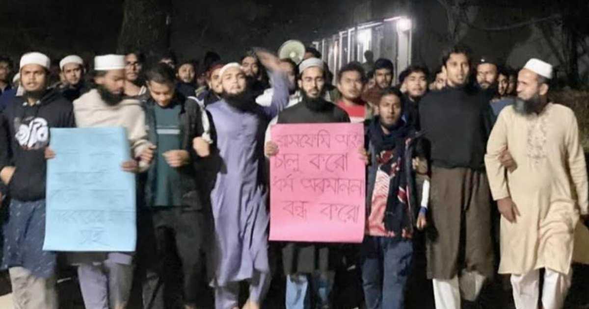 সমাবেশে বাংলা বিভাগের ৪৮তম ব্যাচের শিক্ষার্থী সাইফুল্লাহ সাদ বলেন, ‘মহান আল্লাহর শানে যারা বেয়াদবি করে, কটূক্তি করে তাদের কখনও কোনও ধর্ম থাকতে পারে না। তারা কখনও বাউলের বেশে কখনও শিক্ষকের বেশে আবার কখনও রিকশাওয়ালার বেশে আমাদের ধর্মীয় অনুভূতিতে আঘাত হেনেছে। আমরা মনে করি, এটা আসলে কাকতালীয় নয় বরং এদের পরিকল্পিতভাবে করা হচ্ছে। এটি রোধে ব্লাসফেমি আইন প্রণয়নের দাবি জানাচ্ছি আমরা।’