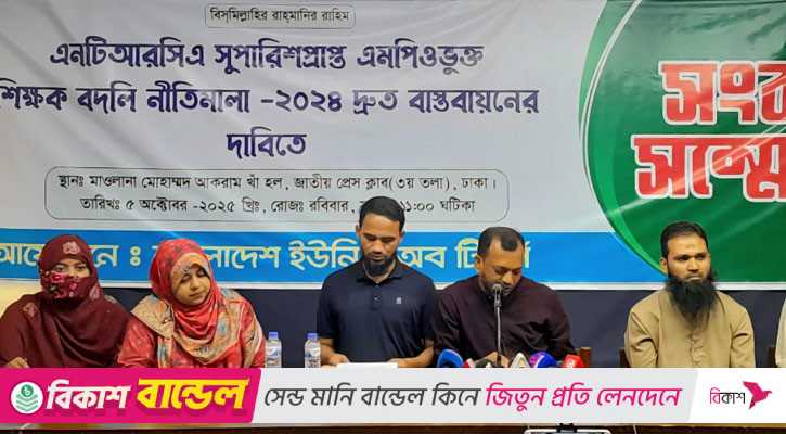 বেসরকারি শিক্ষক নিবন্ধন ও প্রত্যয়ন কর্তৃপক্ষের (এনটিআরসিএ) মাধ্যমে নিয়োগপ্রাপ্ত এমপিওভুক্ত শিক্ষকদের দ্রুত বদলি নীতিমালা বাস্তবায়নের দাবি জানিয়েছে বাংলাদেশ ইউনিটি অব টিচার্স।