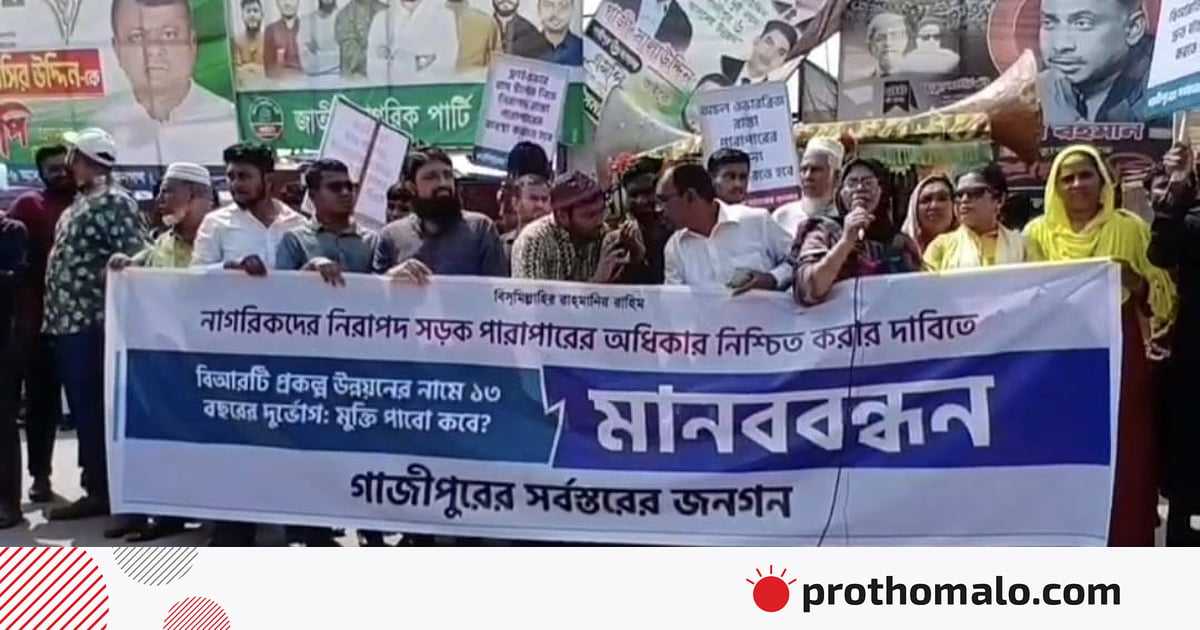 ঢাকা-ময়মনসিংহ মহাসড়কে চলমান বাস র্যাপিড ট্রানজিট (বিআরটি) প্রকল্পের কাজ এক যুগের বেশি সময়েও শেষ না হওয়ায় গাজীপুরে মানববন্ধন অনুষ্ঠিত হয়েছে। আজ সোমবার দুপুরে গাজীপুরের সর্বস্তরের জনগণের ব্যানারে টঙ্গী সরকারি কলেজ গেট এলাকায় এ মানববন্ধন হয়।