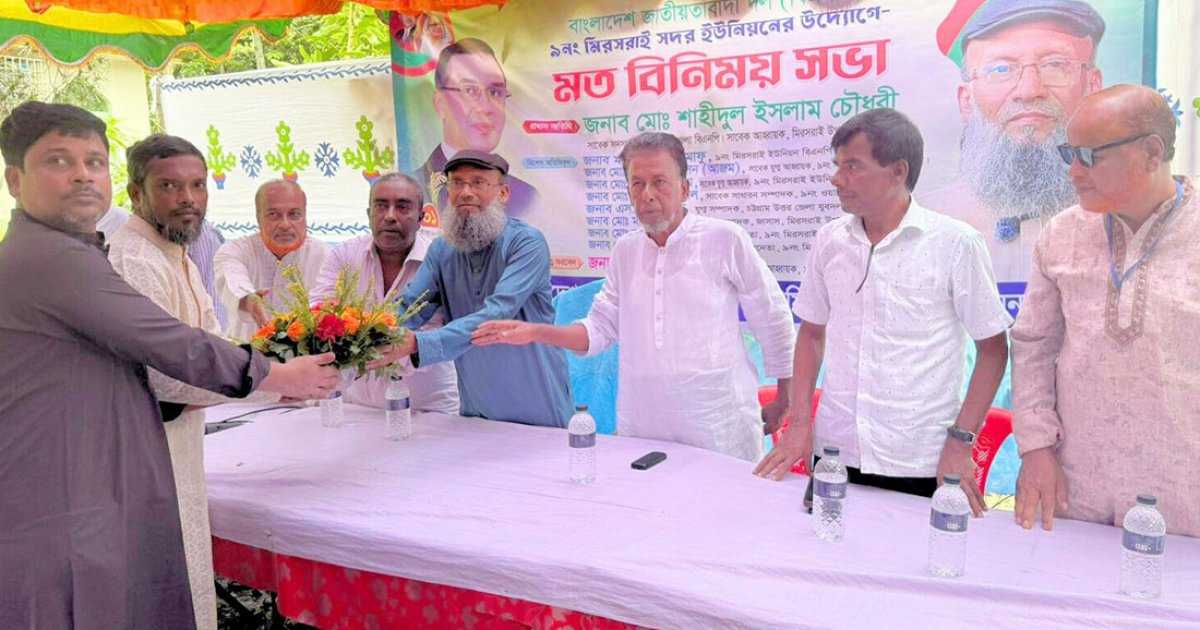 ৯নং মীরসরাই সদর ইউনিয়ন বিএনপির সাবেক যুগ্ম আহ্বায়ক মো. ইমাম হোসেনের সভাপতিত্বে ও উপজেলা জাসাসের সাধারণ সম্পাদক মাসুম বিল্লাহর সঞ্চালনায় আয়োজিত এ মতবিনিময় সভায় প্রধান অতিথির বক্তব্য রাখেন মীরসরাই উপজেলা বিএনপির সাবেক আহ্বায়ক শাহীদুল ইসলাম চৌধুরী।