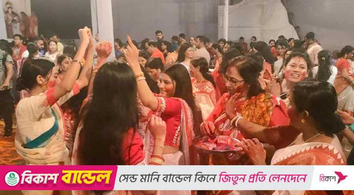 এর আগে নানা বয়সী নারীরা মা দুর্গাকে প্রণাম, মিষ্টি, পান, পায়ে সিঁদুর দিয়ে বিদায় জানান। এরপরএকে অপরের মুখে সিঁদুর মাখিয়ে দেন।