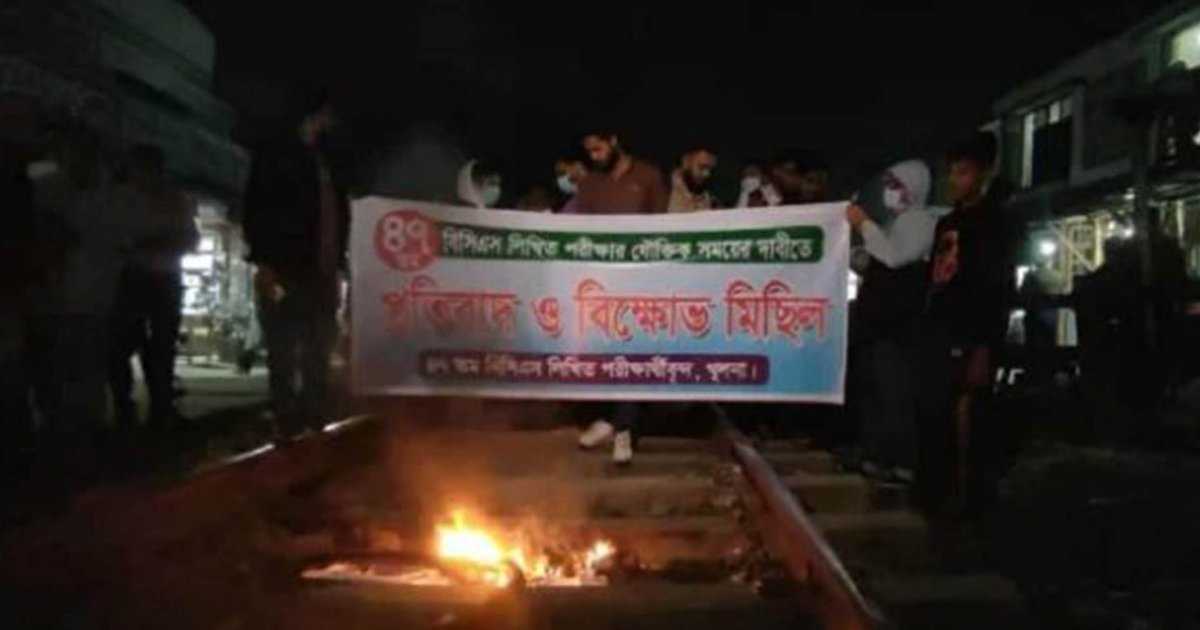 ৪৭তম বিসিএসের লিখিত পরীক্ষার প্রস্তুতির জন্য ‘যৌক্তিক সময়ের’ দাবিতে খুলনায় রেললাইন অবরোধ করে বিক্ষোভ করেছেন একদল শিক্ষার্থী। ঢাকা-খুলনা রেলপথ অবরোধের কারণে প্রায় ছয় ঘণ্টা ট্রেন চলাচল বন্ধ ছিল। ফলে রাজশাহীগামী সাগরদাঁড়ি এক্সপ্রেস ট্রেনটি নির্ধারিত সময়ে গন্তব্যের উদ্দেশে ছেড়ে যেতে পারেনি। ঢাকা থেকে ছেড়ে আসা সুন্দরবন এক্সপ্রেস দৌলতপুর রেলস্টেশনের কাছে আটকে ছিল।
