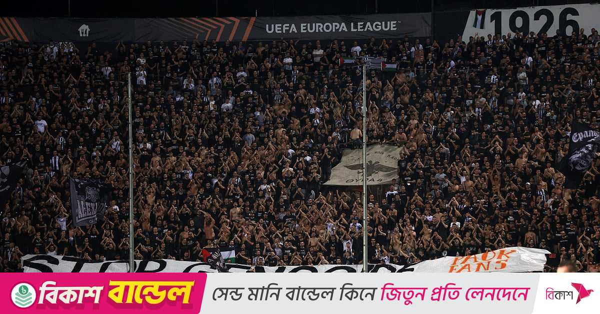 এরই মধ্যে গ্রিসের ক্লাব পিএওকের সমর্থকেরা ইউরোপা লিগে ইসরায়েলি দল ম্যাকাবি তেল আবিবের বিপক্ষে ম্যাচে ফিলিস্তিনি পতাকা উড়িয়ে, ব্যানার ধরে প্রতিবাদ জানিয়েছেন। ব্যানারে লেখা ছিল ‘গণহত্যা বন্ধ করো’ এবং ‘ইসরায়েলকে লাল কার্ড দেখাও।’ স্টেডিয়ামে শোনা গেছে ‘ফ্রি প্যালেস্টাইন’ স্লোগানও।