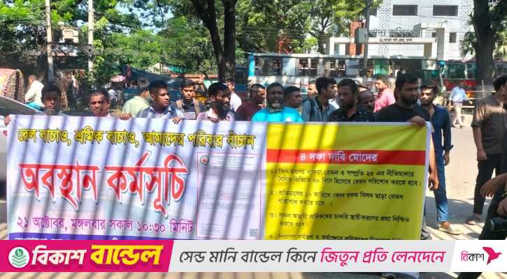 মঙ্গলবার (২১ অক্টোবর) বাংলাদেশ রেল ভবনের সামনে অবস্থান কর্মসূচি থেকে এ দাবি জানান তারা।