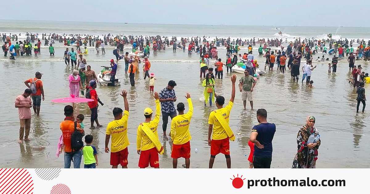 গত বুধবার দুপুরে সৈকতে সুগন্ধা পয়েন্টে নেমে দেখা গেছে, ২০ হাজারের বেশি মানুষ সমুদ্রের পানিতে নেমে গোসল করছেন। চৌকিতে বসে, বালুচরে দাঁড়িয়ে কিংবা কোমরসমান পানিতে নেমে পর্যটকের নিরাপত্তা দিচ্ছেন কয়েকজন লাইফগার্ড। ঢেউয়ের ধাক্কায় কোনো পর্যটক টিউব থেকে ছিটকে পড়লে তাৎক্ষণিকভাবে উদ্ধার করে আনছেন লাইফগার্ডরা। লাইফগার্ডদের পরনে থাকে লাল-হলুদ টি–শার্ট ও প্যান্ট। মুখে বাঁশি, হাতে উদ্ধার সরঞ্জাম।