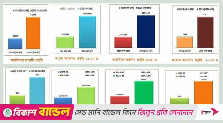 চট্টগ্রাম: চলতি অর্থবছরের প্রথম তিন মাসে (জুলাই-সেপ্টেম্বর) চট্টগ্রাম বন্দরে কনটেইনার, কার্গো ও জাহাজ হ্যান্ডলিং আগের অর্থ ছরের একই সময়ের তুলনায় বেড়েছে। ২০২৫-২৬ অর্থবছরের জুলাই-সেপ্টেম্বরে চট্টগ্রাম বন্দরে ৯ লাখ ২৭ হাজার ৭১৩ টিইইউস (২০ ফুট দীর্ঘ) কনটেইনার হ্যান্ডলিং হয়েছে, যা গত অর্থবছরের একই সময়ের চেয়ে ১ লাখ ১ হাজার ১৮৫ টিইইউস বেশি।