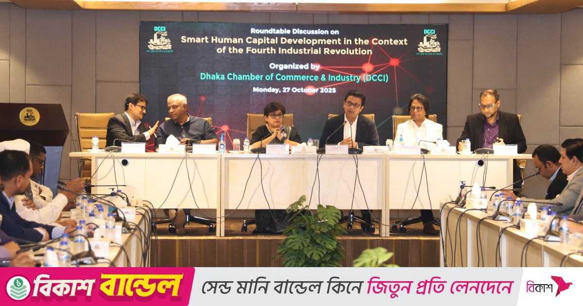 সোমবার (২৭ অক্টোবর) রাজধানীর ডিসিসিআই মিলনায়তনে ঢাকা চেম্বার অব কমার্স অ্যান্ড ইন্ডাস্ট্রি (ডিসিসিআই) আয়োজিত ‘চতুর্থ শিল্প বিপ্লবের প্রেক্ষাপটে স্মার্ট মানবসম্পদ উন্নয়ন’ শীর্ষক গোলটেবিল আলোচনা সভায় এ আহ্বান জানানো হয়। অনুষ্ঠানে প্রধান অতিথি ছিলেন জাতীয় দক্ষতা উন্নয়ন কর্তৃপক্ষের (এনএসডিএ) নির্বাহী চেয়ারম্যান ড. নাজনীন কাউসার চৌধুরী।