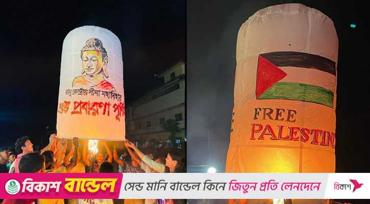 কক্সবাজার: ফ্রি প্যালেস্টাইন, স্টপ জেনোসাইড’ এ বার্তায় আকাশে ফানুস ওড়ানোর মধ্য দিয়ে এবার কক্সবাজারের বৌদ্ধবিহারে প্রবারণা পূর্ণিমা উদযাপন করা হয়েছে।