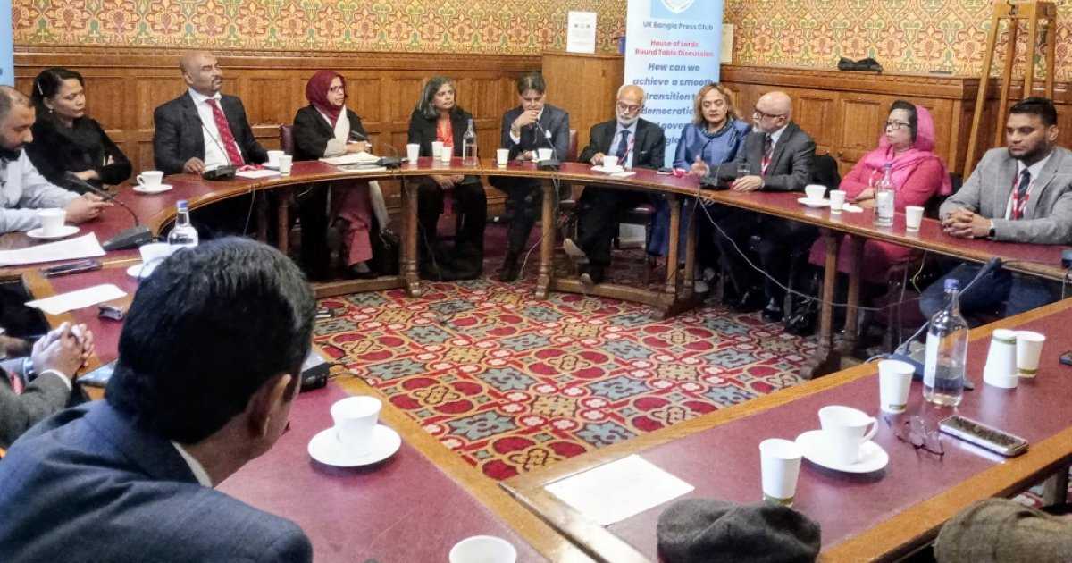ব্রিটেনের বাংলা গণমাধ্যমকর্মীদের সংগঠন ইউকে বাংলা প্রেস ক্লাবের উদ্যোগে সোমবার (২০ অক্টোবর) অনুষ্ঠিত এ বৈঠকের সভাপতিত্ব করেন হাউজ অব লর্ডসের সদস্য ব্যারোনেস পলা মঞ্জিলা উদ্দীন। আলোচনার মূল বিষয় ছিল, ‘বাংলাদেশের ভবিষ্যৎ–কীভাবে গণতান্ত্রিকভাবে নির্বাচিত সরকারের কাছে মসৃণভাবে ক্ষমতা হস্তান্তর করা যায়।’