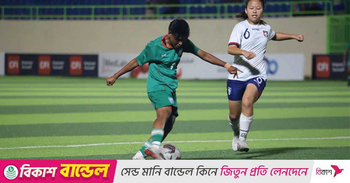 দুই মিনিট পর বাংলাদেশের দুর্ভাগ্য। মামনি চাকমার ক্রসে জালে বল ঠেলেন প্রীতি। তবে অফসাইডের কারণে গোল পায়নি বাংলাদেশ। শেষ পর্যন্ত জোড়া গোলে পিছিয়ে থেকেই বিরতিতে যায় সাইফুল বারী টিটুর দল।