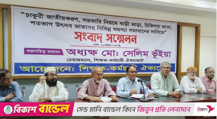 বেসরকারি শিক্ষক কর্মচারীদের চাকরি জাতীয়করণ, সরকারি নিয়মে বাড়ি ভাড়া, চিকিৎসা ভাতাসহ বিভিন্ন দাবি জানিয়েছেন শিক্ষক কর্মচারী ঐক্যজোট।