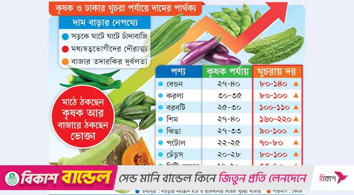বগুড়ার কৃষকরা পাইকারিতে বেগুন বিক্রি করছেন প্রতি কেজি ২৭ থেকে ৪০ টাকা। খুলনার কৃষকরা বটিয়াঘাটা ও ডুমুরিয়ার বাজারে ভালোমানের বেগুন বিক্রি করেন ৫০ থেকে ৫৫ টাকা কেজি। রাজধানীর খুচরা বাজারে সেই বেগুন মানভেদে ৮০ থেকে ১৪০ টাকা। কৃষক পর্যায়ে করলা বিক্রি হচ্ছে প্রতি কেজি ৩০ থেকে ৩৫ টাকা, রাজধানীর খুচরা বাজারে তা ৮০ থেকে ১০০ টাকা।
