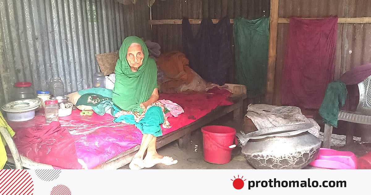 নবতিপর হালিমা বেগম বয়সের ভারে অনেকটাই ন্যুব্জ। থাকেন ছোট্ট একটা ঝুপড়িতে। মাটি ছুঁই ছুঁই একটি চৌকির ওপর প্লাস্টিকের কয়েকটি বয়াম ও প্লেট। তেলচিটচিটে একটি বালিশ, একটি কম্বল ও এক প্রান্তে প্লাস্টিকের একটি বস্তা। ঘরের এক কোনায় প্লাস্টিকের কমোডওয়ালা চেয়ার বসানো। একচালা ঘরে বৃষ্টির পানি পড়ে। মেঝেতে ইঁদুর মাটি উঠিয়েছে। প্রায় অন্ধকার ঘরটির মাথার ওপর বাঁশের সঙ্গে ঝুলছে একটি টেবিল ফ্যান। জীবনসায়াহ্নে এই ঘরের চৌকিতে শুয়ে-বসে কাটছে তাঁর সময়।