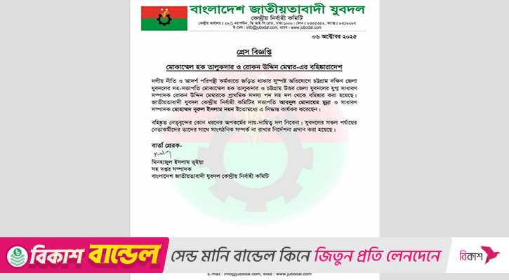 প্রেসবিজ্ঞপ্তিতে বলা হয়, দলীয় নীতি ও আদর্শ পরিপন্থী কর্মকান্ডে জড়িত থাকার সুস্পষ্ট অভিযোগে চট্টগ্রাম দক্ষিণ জেলা যুবদলের সহ-সভাপতি মোকাম্মেল হক তালুকদার ও চট্টগ্রাম উত্তর জেলা যুবদলের যুগ্ম সাধারণ সম্পাদক রোকন উদ্দিন মেম্বারকে প্রাথমিক সদস্য পদ সহ দল থেকে বহিষ্কার করা হয়েছে। জাতীয়তাবাদী যুবদল কেন্দ্রীয় নির্বাহী কমিটির সভাপতি আবদুল মোনায়েম মুন্না ও সাধারণ সম্পাদক মোহাম্মদ নূরুল ইসলাম নয়ন ইতোমধ্যে এ সিদ্ধান্ত কার্যকর করেছেন।