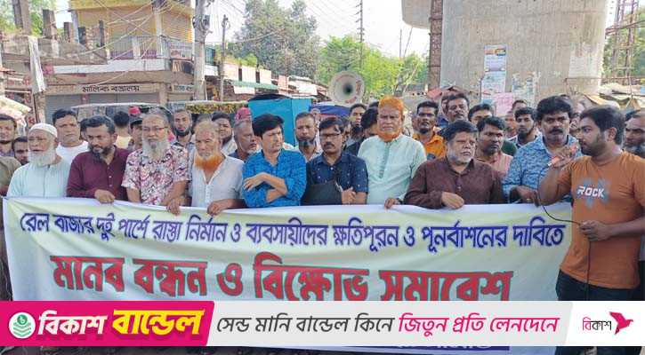 মানববন্ধনে বক্তারা বলেন, রেলবাজার এলাকার সড়ক সম্প্রসারণ প্রকল্পের কাজের কারণে চলাচল ও ব্যবসায়িক কার্যক্রম মারাত্মকভাবে ব্যাহত হচ্ছে। প্রতিদিনই ছোট বড় দুর্ঘটনা ঘটছে।