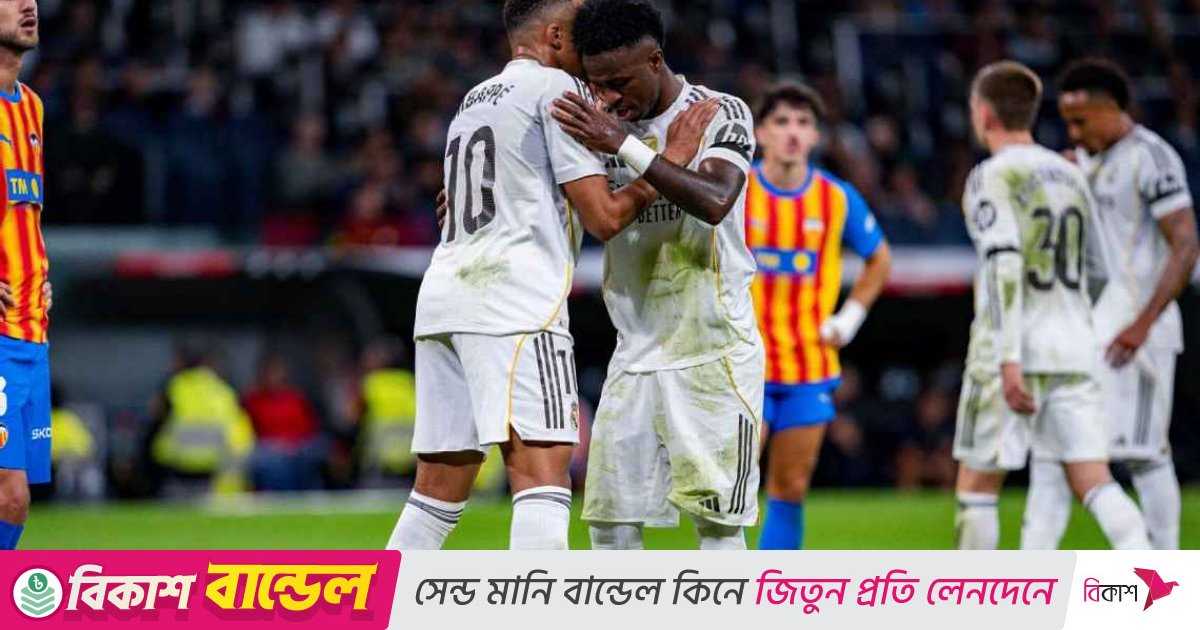 কিলিয়ান এমবাপ্পের জোড়া গোলে ভ্যালেন্সিয়াকে সহজে হারিয়ে লা লিগায় নিজেদের ব্যবধান আরও বাড়িয়ে নিয়েছে রিয়াল মাদ্রিদ। শনিবার সান্তিয়াগো বার্নাব্যুতে ৪–০ গোলের জয়ে শীর্ষে থাকা রিয়াল এখন দ্বিতীয় স্থানের দল ভিয়ারিয়ালের চেয়ে সাত পয়েন্টে এগিয়ে।