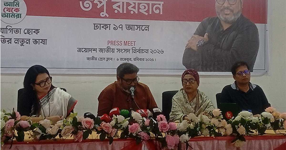 ত্রয়োদশ জাতীয় সংসদ নির্বাচনে ঢাকা-১৭ আসন থেকে নির্বাচন করার ঘোষণা দিয়েছেন প্রয়াত লেখক ও চলচ্চিত্রকার জহির রায়হানের ছেলে তপু রায়হান। রবিবার (৯ নভেম্বর) রাজধানীর জাতীয় প্রেসক্লাবের আবদুস সালাম হলে আয়োজিত এক সংবাদ সম্মেলনে নির্বাচনে লড়ার ঘোষণা দেন তিনি।