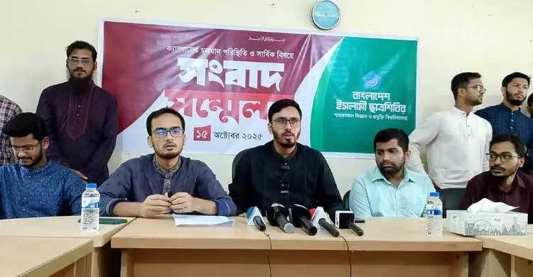 কেন্দ্রীয় ছাত্রসংসদ নির্বাচন দ্রুততম সময়ের মধ্যে বাস্তবায়নসহ সিলেটের শাহজালাল বিজ্ঞান ও প্রযুক্তি বিশ্ববিদ্যালয়ের (শাবিপ্রবি) সমসাময়িক পরিস্থিতি নিয়ে সংবাদ সম্মেলন করেছেন শাখা ছাত্রশিবির।