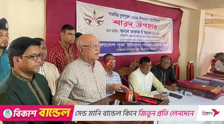 শনিবার (২৭ সেপ্টেম্বর) বিকেলে নগরীর জামালখানে বাংলাদেশ হিন্দু ফাউন্ডেশন মিলনায়তনে শারদীয় দুর্গাপূজা-২০২৫ উপলক্ষে বস্ত্র বিতরণ অনুষ্ঠানে প্রধান অতিথির বক্তব্যে এ কথা বলেন।