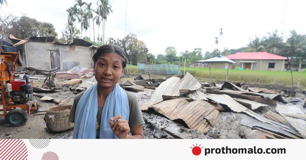 পোড়া বাড়ির সমানে বসে আছেন চিয়া প্রু মারমা (২১)। আগুনে পুড়ে পুরোটা ছাই হয়ে গেছে তাঁদের আধা পাকা ঘরটি। সেখানে পড়ে আছে পোড়া নানা নিত্যপ্রয়োজনীয় জিনিসপত্র। জানালা পুড়ে কয়লা। দেয়ালে পোড়া চিহ্ন। যেকোনো মুহূর্তে ধসে পড়তে পারে।