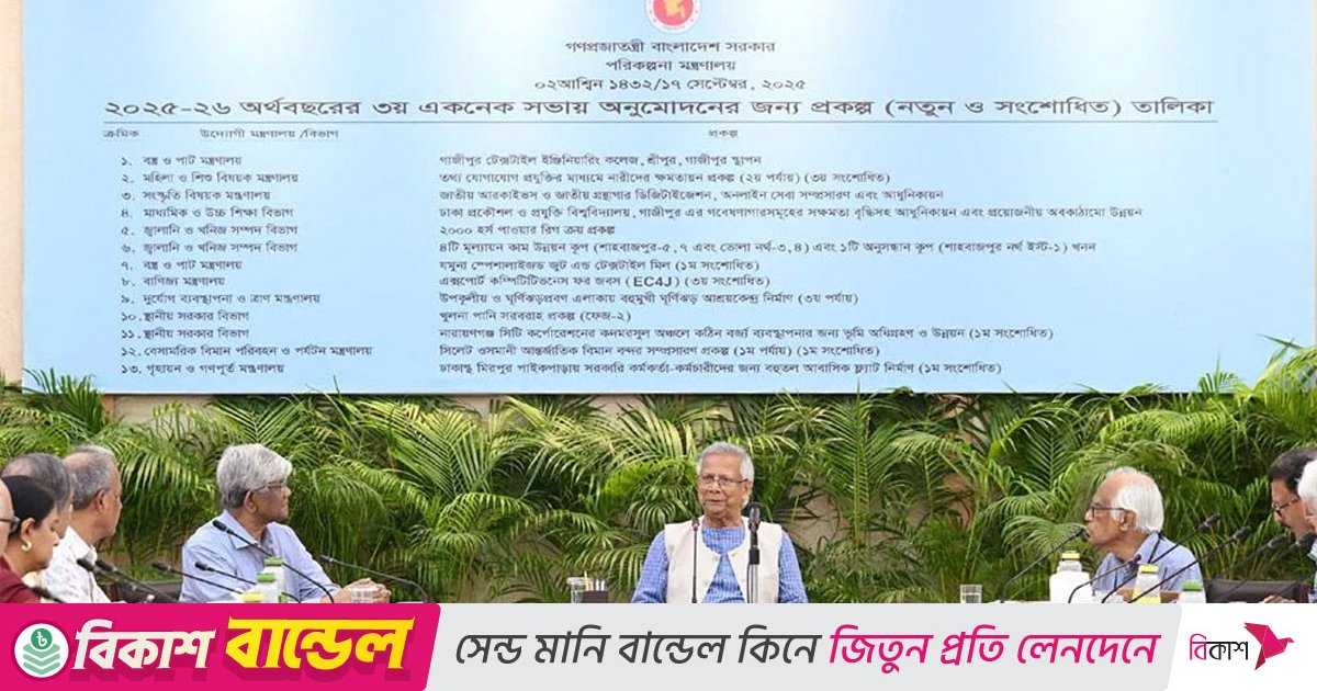 প্রধান উপদেষ্টা এবং একনেকের চেয়ারপারসন ড. মুহাম্মদ ইউনূসের সভাপতিত্বে পরিকল্পনা কমিশনের এনইসি সম্মেলন কক্ষে অনুষ্ঠিত একনেক সভায় এ অনুমোদন দেওয়া হয়। এর মধ্যে নতুন প্রকল্প ৭টি, সংশোধিত প্রকল্প ৫টি এবং ব্যয় বৃদ্ধি ব্যতিরেকে মেয়াদ বৃদ্ধির ১টি প্রকল্প রয়েছে।