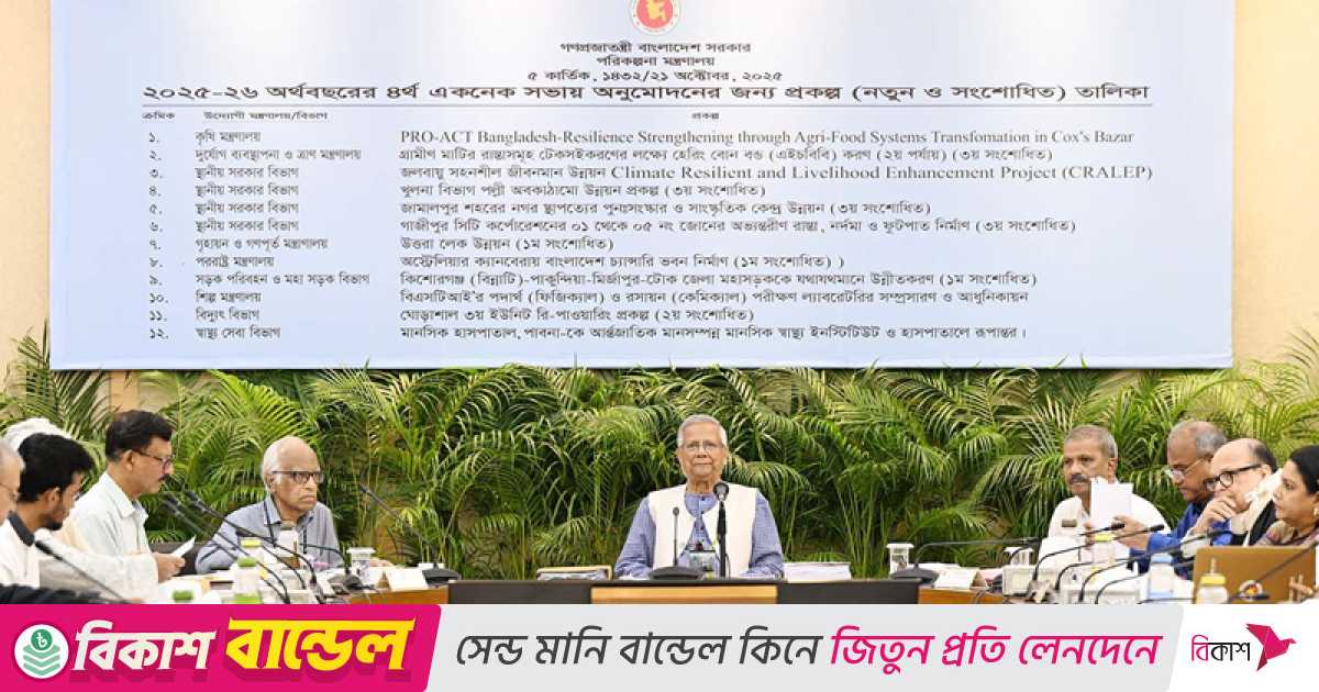মঙ্গলবার (২১ অক্টোবর) প্রধান উপদেষ্টা ও একনেক চেয়ারপারসন ড. মুহাম্মদ ইউনূসের সভাপতিত্বে রাজধানীর শেরেবাংলা নগরে এনইসি সম্মেলন কক্ষে অনুষ্ঠিত একনেক সভায় এসব নির্দেশনা দেওয়া হয়।