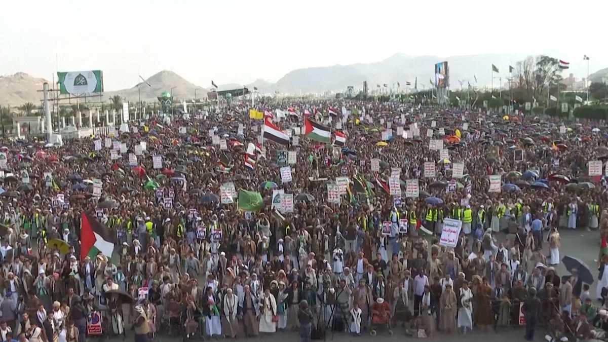 ফিলিস্তিনিদের সঙ্গে সংহতি প্রকাশের জন্য জড়ো হয় লাখ লাখ বিক্ষুব্ধ জনতা। এদের মধ্যে বেশির ভাগই হুতি সমর্থক। এ সময় ইসরায়েলের বিরুদ্ধে স্লোগান দিতে থাকে আন্দোলনকারীরা। সমাবেশে ফিলিস্তিনের পতাকা ও ব্যানার দেখা যায় তাদের হাতে।