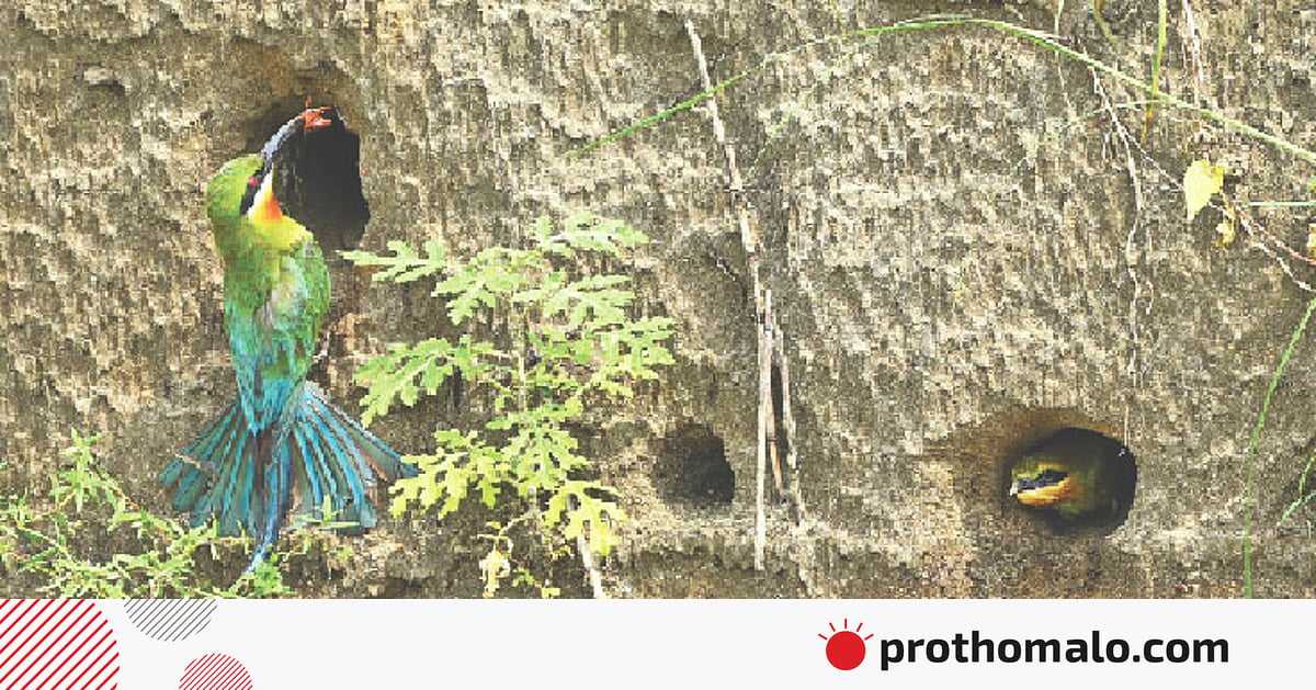 দিনটা ছিল গত ৭ জুন। ভারী বৃষ্টি শুরু হলো। বৃষ্টির পানিতে ঢাকার আশপাশের ডোবা-নালা পানিতে টইটম্বুর। চারদিকে গাছপালাগুলো সতেজ সবুজ। এ সময় পাখিদের বাসা বানানোর ভরা মৌসুম। পাখিরা তাদের সংসার নিয়ে খুব ব্যস্ত। এবার বেশ কয়েকটা পাখির বাসা রাজধানীর উত্তরার দিয়াবাড়ির মেট্রোরেল ডিপোর দক্ষিণ পাশের একটি বালুর ঢিবিতে দেখা গেছে। এর একটি বাসা ধলাবুক মাছরাঙার। বাকিগুলো নীললেজ সুইচোরার। সম্ভবত এই সুইচোরাদের একটি বাসা দখল করে মাছরাঙারা সংসার পেতেছে। বাসাগুলোর সন্ধান পেয়েছেন আমার বন্ধু আসকার ইবনে ফিরোজ। তিনি আমাকে পাখির খোঁজখবর দেন। বেশ কিছুদিন ধরে তিনি ঢাকার পাখির ওপর একটি তথ্যচিত্র বানাচ্ছেন। নাম দিয়েছেন ঢাকার পাখি: ছোট হয়ে আসছে আকাশ। এ কাজ করতে গিয়েই বাসাগুলোর দেখা পান তিনি।