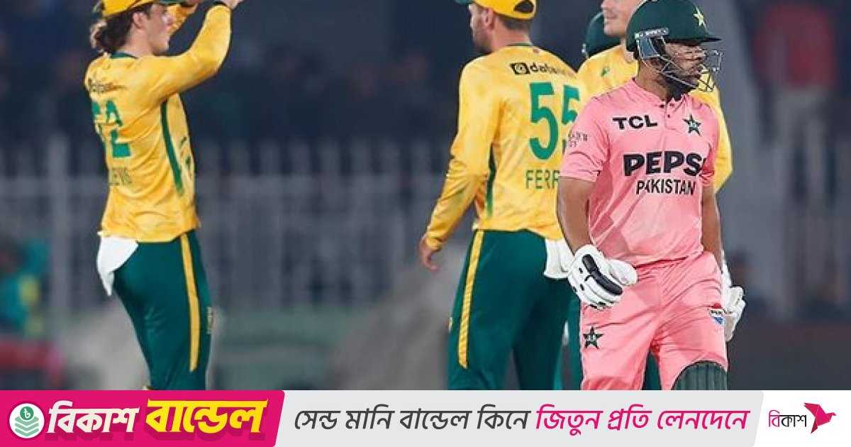 ইনিংসের শুরুতে বেশ সতর্ক ছিল পাকিস্তান। শাহেবজাদা ফারহান ও সাইম আয়ুব জুটি প্রথম উইকেটে যোগ করেন ৩১ রান। কিন্তু ফারহান ১৯ বলে ২৪ রান করে লিজাড উইলিয়ামসের বলে বোল্ড হলে ভাঙে উদ্বোধনী জুটি। এরপরই বড় ধাক্কা খায় স্বাগতিকরা। দলে ফেরা বাবর আজম মাত্র দুই বল খেলেই করবিন বশের শিকার হন ‘ডাক’ মেরে। পরের ওভারে পাকিস্তান অধিনায়ক সালমান আলী আগাও (২) বশের দ্বিতীয় শিকার হলে ৭.২ ওভারে স্কোর দাঁড়ায় ৪৩/৩।