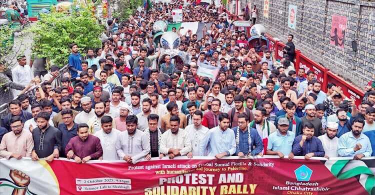 ফিলিস্তিনের গাজায় অবরোধ ভাঙতে যাওয়া গ্লোবাল সুমুদ ফ্লোটিলায় ইসরায়েলি হামলার প্রতিবাদ ও মানবিক সহায়তা যাত্রায় সংহতি জানিয়ে রাজধানীতে মিছিল করেছে বাংলাদেশ ইসলামী ছাত্রশিবির।