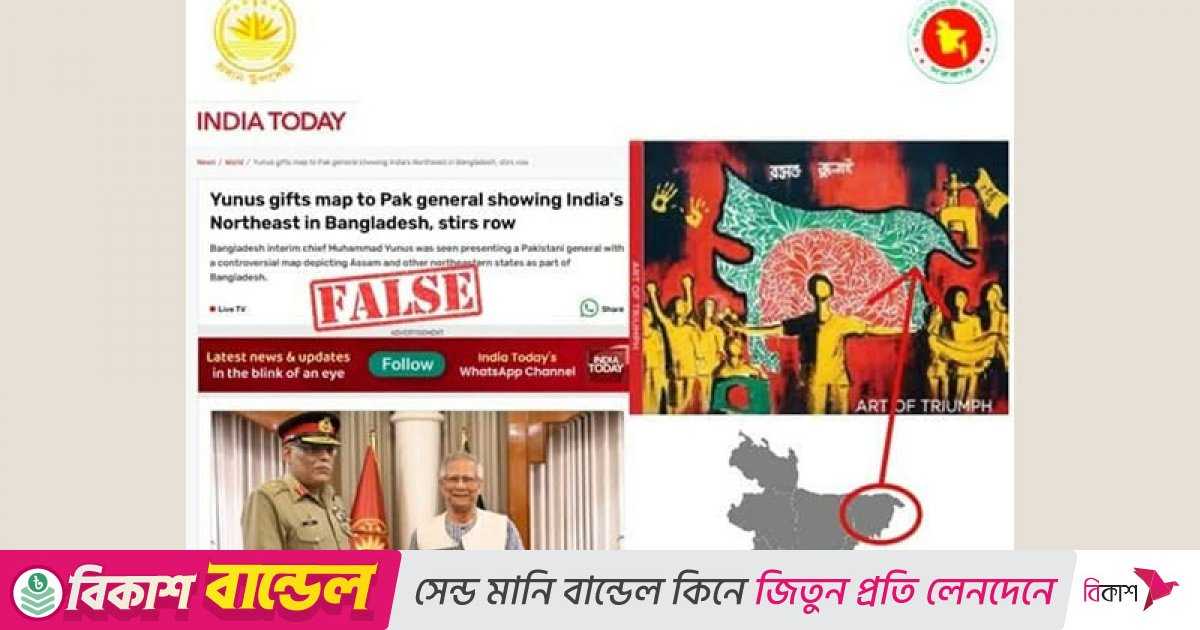ভারতীয় সংবাদমাধ্যম ইন্ডিয়া টুডে এক প্রতিবেদনে দাবি করেছে, বাংলাদেশের প্রধান উপদেষ্টা অধ্যাপক ড. মুহাম্মদ ইউনূস পাকিস্তানের যৌথ বাহিনীর চেয়ারম্যান (সিজেসিসি) জেনারেল সাহির শামশাদ মির্জাকে একটি পতাকা উপহার দিয়েছেন। যেখানে বাংলাদেশের পতাকায় ভারতের উত্তর পুর্বাঞ্চলকে জুড়ে দেওয়া হয়েছে। দাবিটি সম্পূর্ণ অসত্য এবং কল্পনাপ্রসূত বলে জানিয়েছে প্রধান উপদেষ্টার প্রেস উইং।