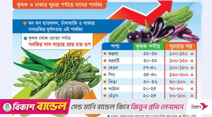 এসব করলা বগুড়ার কৃষক পর্যায়ে প্রতি কেজি ৩২ থেকে ৩৮ টাকায় বিক্রি হচ্ছে। নরসিংদী, পাবনা ও মেহেরপুরের পাইকারি বাজারে এসব করলা ৫০ থেকে ৬৫ টাকা। রাজধানীতে খুচরায় বরবটি ১০০ থেকে ১২০ টাকা কেজি। বগুড়ার মহাস্থান হাটে কৃষকরা বরবটি ৩০ থেকে ৩২ টাকায় বিক্রি করছেন। নরসিংদী, পাবনা ও মেহেরপুরের বিভিন্ন পাইকারি বাজারে বরবটি ৫০ থেকে ৭৫ টাকা। রাজধানীর খুচরা বাজারে পটোল বিক্রি হচ্ছে ৭০ থেকে ৮০ টাকায়। বগুড়ার কৃষক পর্যায়ে পটোলের কেজি ২০ থেকে ২৫ টাকা। রাজধানীর খুচরা বাজারে প্রতি কেজি ঝিঙা ৯০ থেকে ১০০ টাকা। বগুড়ায় কৃষকরা পাইকারিতে প্রতি কেজি ঝিঙা ৩০ থেকে ৩৬ টাকায় বিক্রি করছেন।