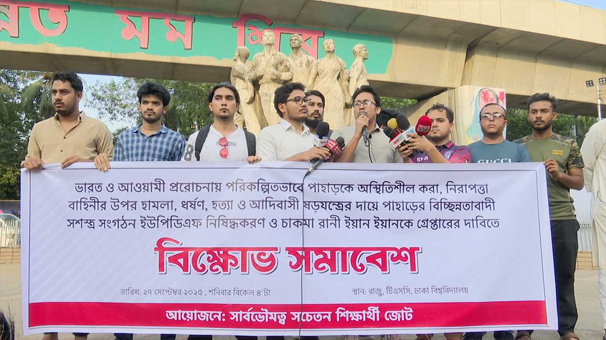 পাহাড়ে অস্থিতিশীল পরিস্থিতি সৃষ্টির অভিযোগে ইউপিডিএফ নিষিদ্ধ ও চাকমা রানী ইয়ান ইয়ানকে গ্রেফতারের দাবি জানিয়েছে ঢাকা বিশ্ববিদ্যালয়ের শিক্ষার্থীরা।
