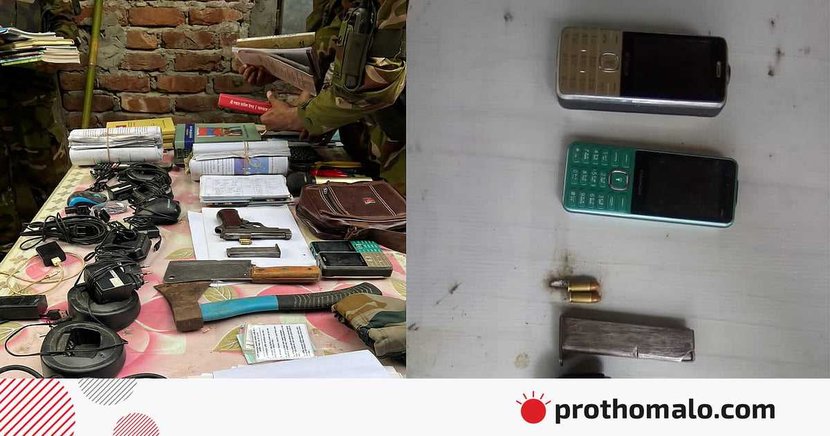 পরবর্তী সময়ে তল্লাশি চালিয়ে সেনাবাহিনী ১টি পিস্তল, ১টি ম্যাগাজিন, ২টি গুলি (অ্যামোনিশন), ১৫টি ব্যানার, ২টি ওয়াকিটকি চার্জার, ২টি মুঠোফোন, ধারালো অস্ত্র ও বিভিন্ন সরঞ্জাম উদ্ধার করে।